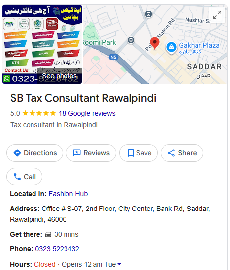 SB Tax Consultants are Providing services Registration of NTN, Registration of STRN, Registration of Business Sole Proprietorship, Registration of Partnership AOP Association of Person, Registration of Private Limited Company, Registration of PRA,SRB,KPRA,BRA , POS Registration, Filing Annual Income Tax Returns, Filling of Monthly Sales Tax Returns(FBR PRA SRB KPRA), Withholding Statements, Bookkeeping, Audit Reports, Appeals, SECP Registration and Filing, Consent Letter, Active Taxpayer Status, Registration with Chamber of Commerce, NTN Profile updating, Password Recovery from all RTO,CTO, Reply to Notices , Trade Mark, Copy Right, Other Legal & Corporate Services. Tax practitioner Income Tax Consultant Sales Tax Consultant Corporate Tax.