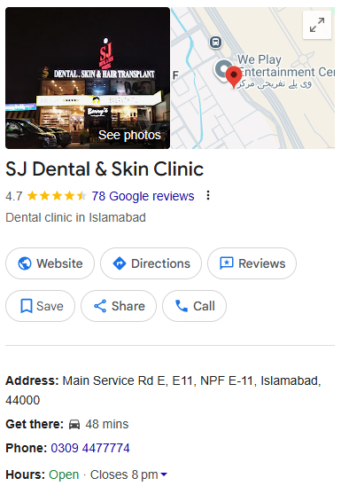 Established in 2018, SJ Dental & Skin Clinic offers a comprehensive suite of services in Islamabad, Pakistan. They specialize in dental care, dermatology, permanent makeup, laser hair removal, and hair transplantation, all under one roof.